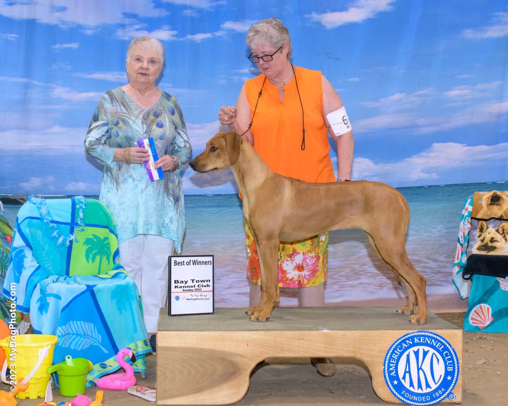 In July Hondo and Aslynn went on to win back to back wins at the Houston World Series Dog Sh0w. 07/19/2023 Houston Area Hound Association under Judge Marla Capozzi he took WD/BW ribbons. 07/20/2023 Houston Kennel Club Inc under Judge Dr. Kenneth H Levison he took WD/BW ribbons. 07/21/2023 under Judge Dr. Anne P Gallant her took WD/BW ribbons. 07/22/2023 Beaumont Kennel Club Inc. under Judge Cheryl Paterson he took a WD ribbon. 07/23/2023 Beaumont Kennel Club Inc under Judge Raymond V Filburn Jr he took WD/BW ribbons.