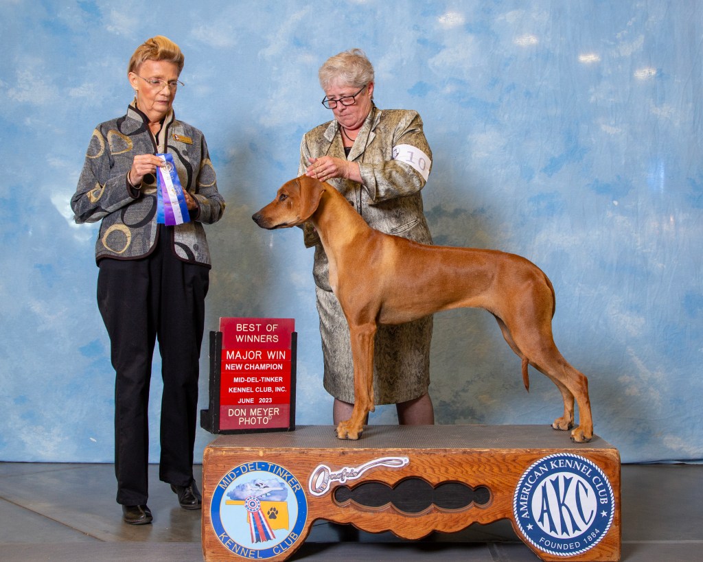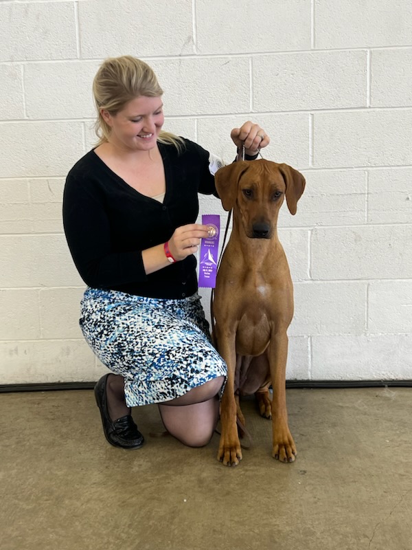 Hondo won a 5 point major at the Dallas, Tx. shows in July 2023 at his very first time in the show ring. We were ecstatic….his family did a fantastic job getting him ready for Aslynn Rose (Professional Handler) to take over his lead.